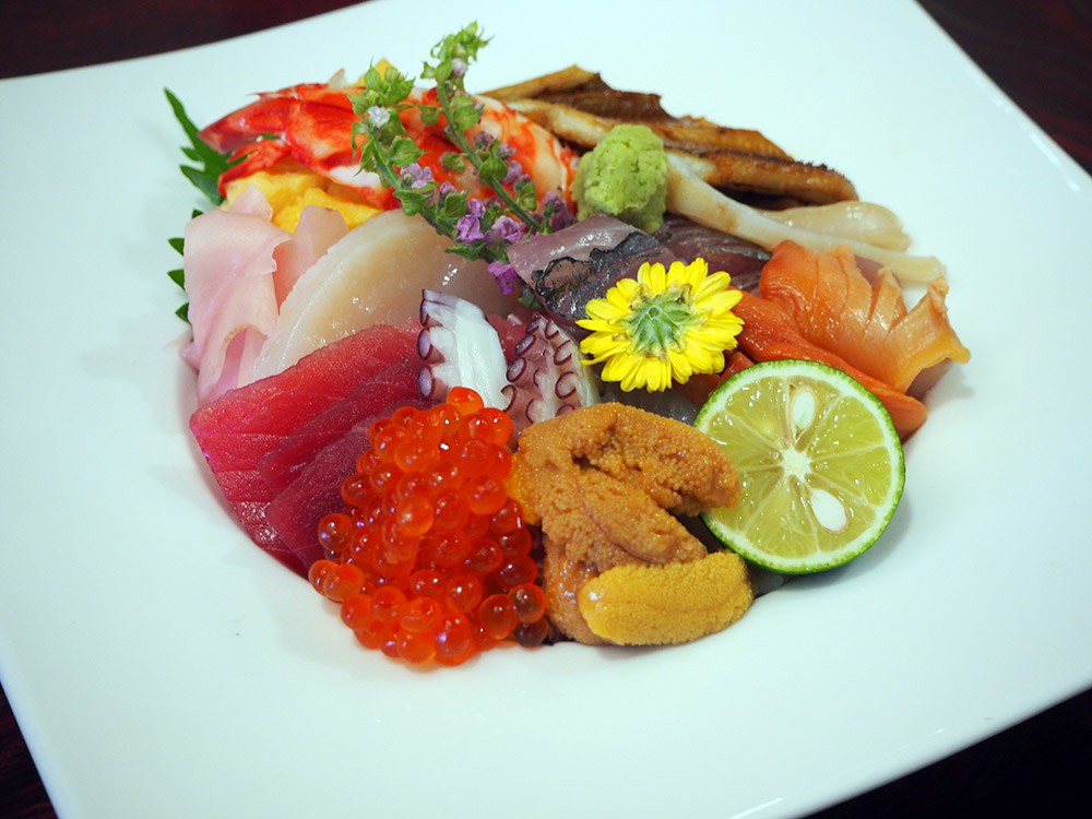 富津近海で取れるスズキやヒラメなどの白身の刺身、貝類、海老、穴子蒲焼を中心に高級食材をふんだんに盛り付けた海堡丼です。