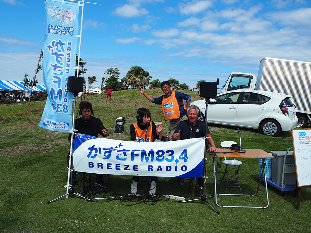 そして会場内を散策しているといつの間にか・・・かずさFMのブースができていました。毎週日曜日に放送されているかずさどこでもラジオの生放送中との事でスタジオと生中継で会場の雰囲気を伝えています。中央は、ラジオパーソナリティの渡辺あゆ香さんで、君津市出身の歌手でもあります。とてもチャーミングですね。