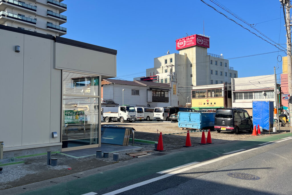 グランパークホテル側が駐車場になり、店舗の奥に見える白い建物は「萩原病院」です。