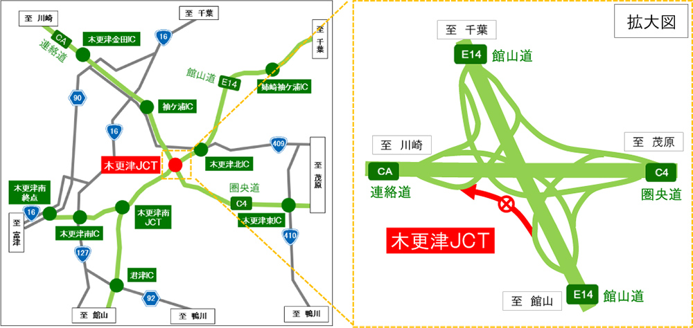 ① 【木更津JCT 】 館山道 上り線から連絡道 上り線(川崎方面)への流入ランプ