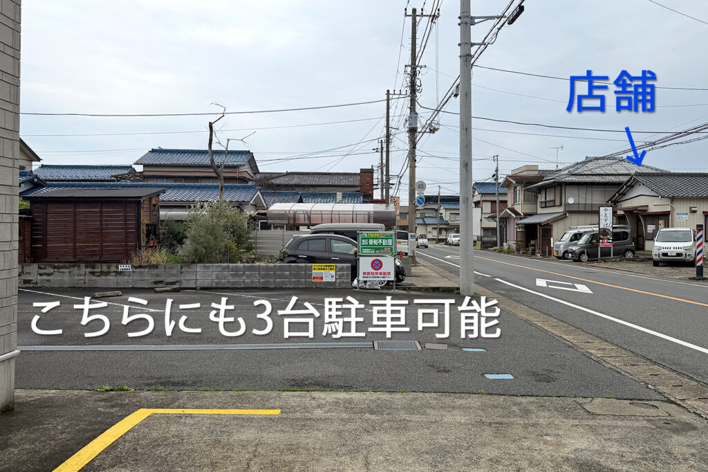 また、店舗前の道路を渡った消防小屋の横(「桜井」バス停そば)の白線部分に3台駐車出来ます。