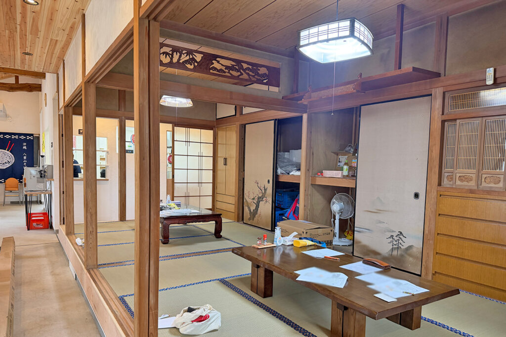 土間を上がると4人席が2卓の広い小上がり席に。新調した畳のヘリは、石垣島の伝統的な織物「ミンサー織り」が使われています。