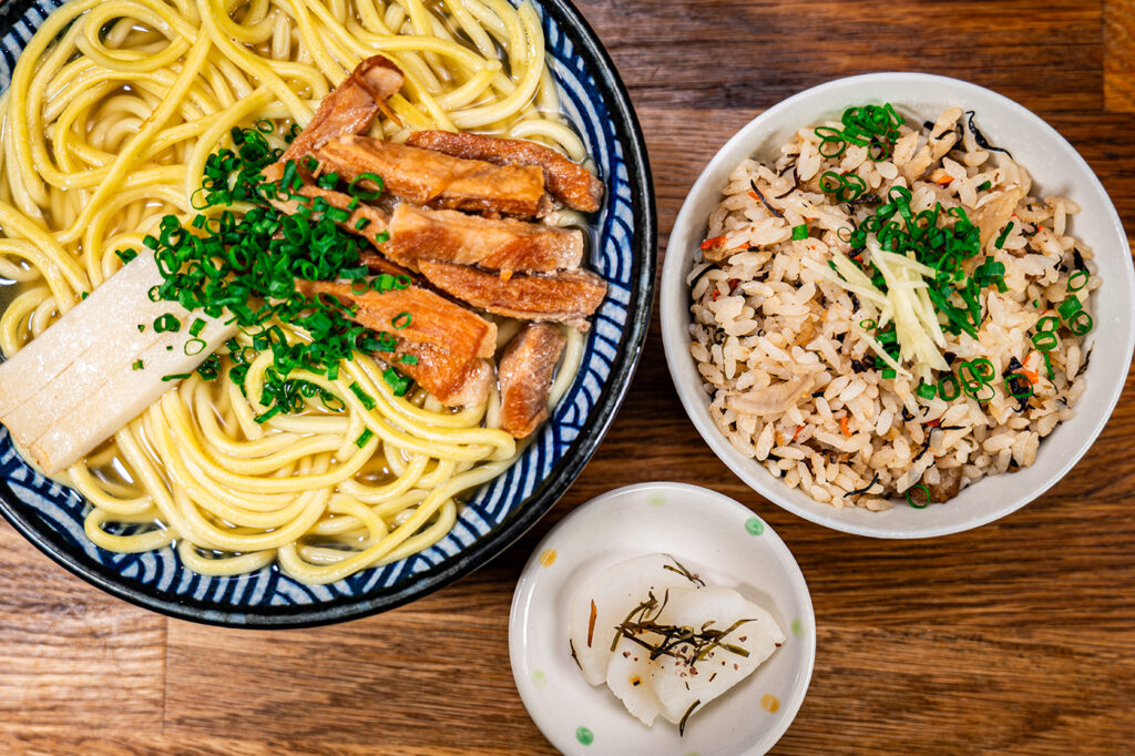「八重山そば」「野菜そば」には、沖縄版の具沢山の炊き込みご飯「じゅーしー」と「お新香」のセットをプラスできます。